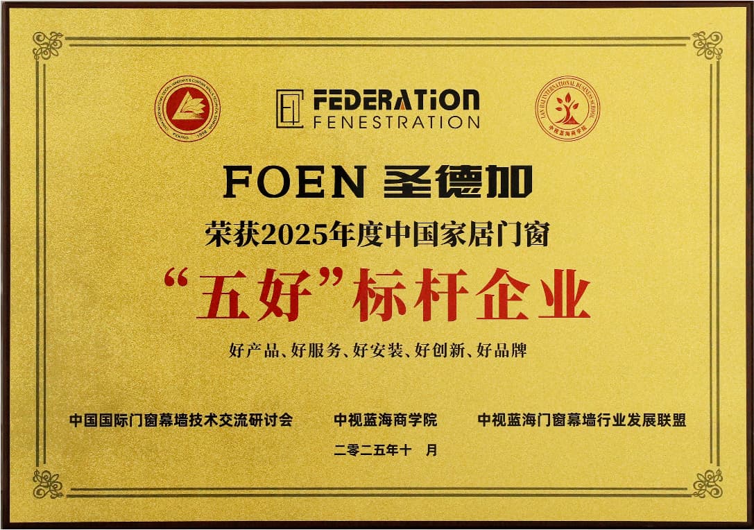 El programa de Selección de Empresas de Referencia "Cinco Excelencias" es un sistema de evaluación de gran prestigio en el sector de puertas y ventanas de China. Realiza una evaluación integral de las empresas en cinco dimensiones: "productos excelentes, servicios excelentes, instalación excelente, innovación excelente y marca excelente". El reconocimiento de FOEN Shengdejia como Empresa de Referencia "Cinco Excelencias" refleja la plena confianza de los expertos del sector y de los consumidores en nuestros productos y servicios.